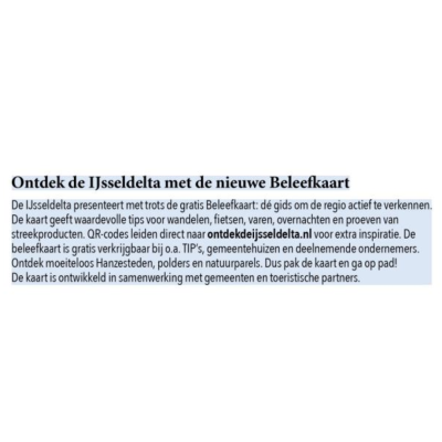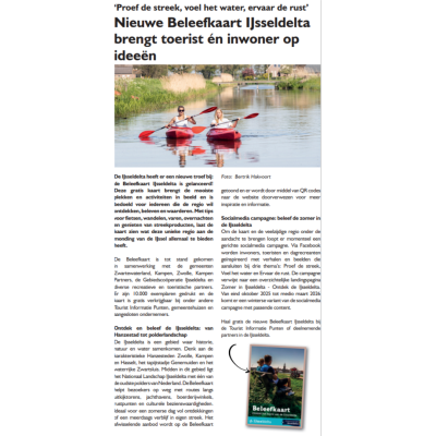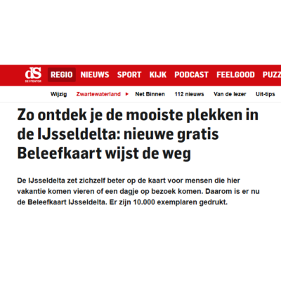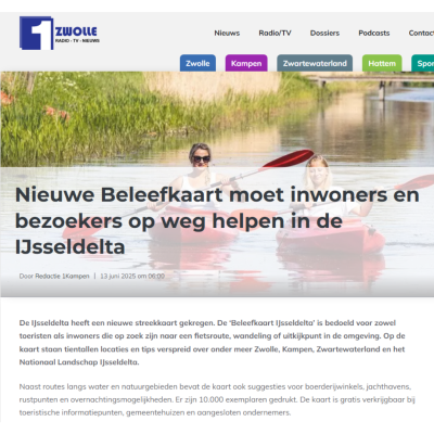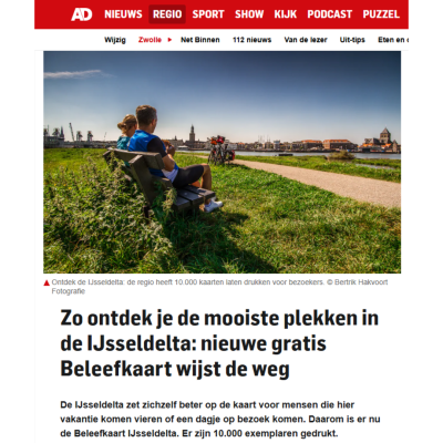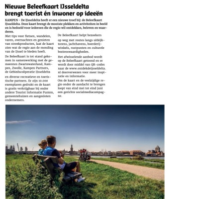 De IJsseldelta heeft er een nieuwe troef bij: de Beleefkaart IJsseldelta is gelanceerd! Deze gratis kaart brengt de mooiste plekken en activiteiten in beeld en is bedoeld voor iedereen die de regio wil ontdekken, beleven en waarderen. Met tips voor fietsen, wandelen, varen, overnachten en genieten van streekproducten, laat de kaart zien wat deze unieke regio aan de monding van de IJssel allemaal te bieden heeft. De Beleefkaart is tot stand gekomen in samenwerking met de gemeenten Zwartewaterland, Kampen, Zwolle, Kampen Partners, de Gebiedscoöperatie IJsseldelta en diverse recreatieve en toeristische partners. Er zijn 10.000 exemplaren gedrukt en de kaart is gratis verkrijgbaar bij onder andere Tourist Informatie Punten, gemeentehuizen en aangesloten ondernemers.